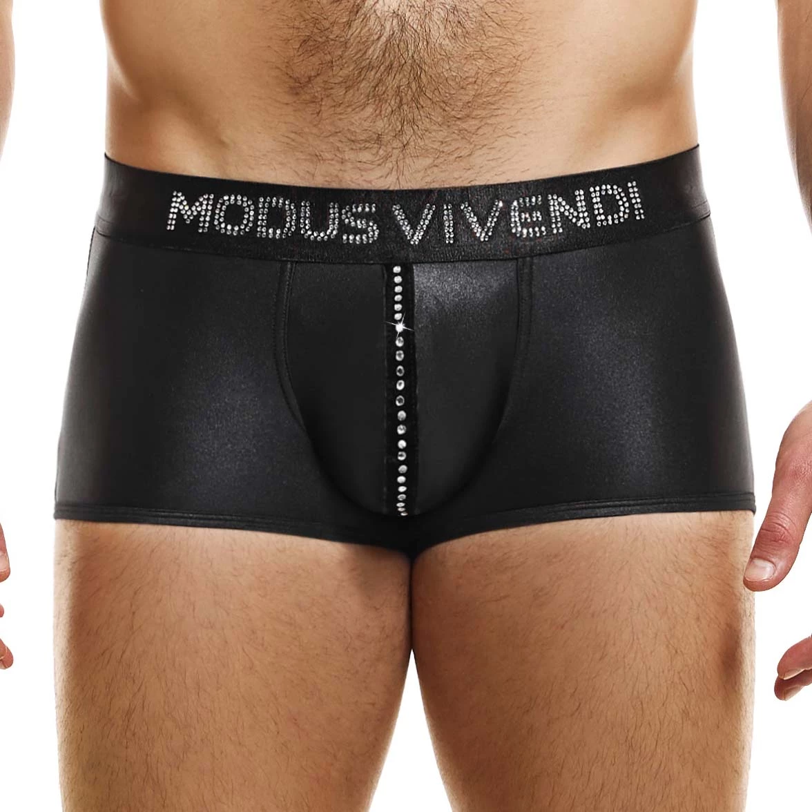 Boxer Modus Vivendi Flashy 19321. Boxer idéal pour être porté toute la journée ou lors dune soirée. Tissu fin satiné élastiqué, ruban de velours décoratif cousu sur le devant avec des pierres de cristal. Le logo Modus Vivendi est soigneusement placé à lavant avec des pierres de cristal thermo-gaufrées. 90% Polyester, 10% Elasthanne.